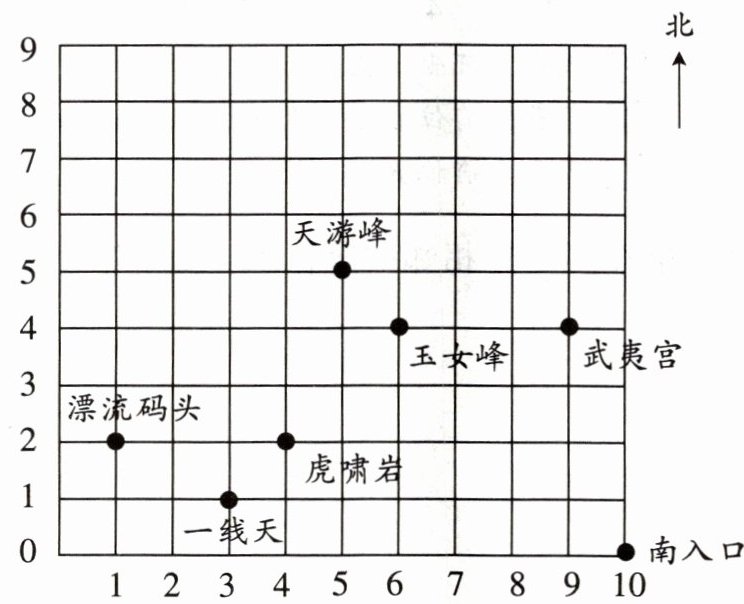 (1)漂流码头:(1,2);虎啸岩:(4,2);玉女峰:(6,4);一线天:(3,1)