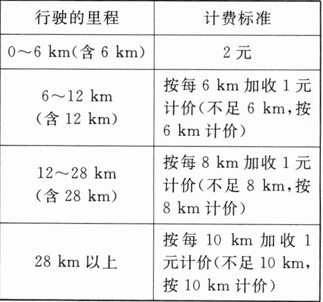 $12$到$28$公里部分,$27 - 12 = 15$公里,$15÷8 = 1\cdots\cdots7$,其中$7$公里不足$8$公里按$8$公里计价,所以这部分按$2$个$8$公里计算,费用为$2$元。
