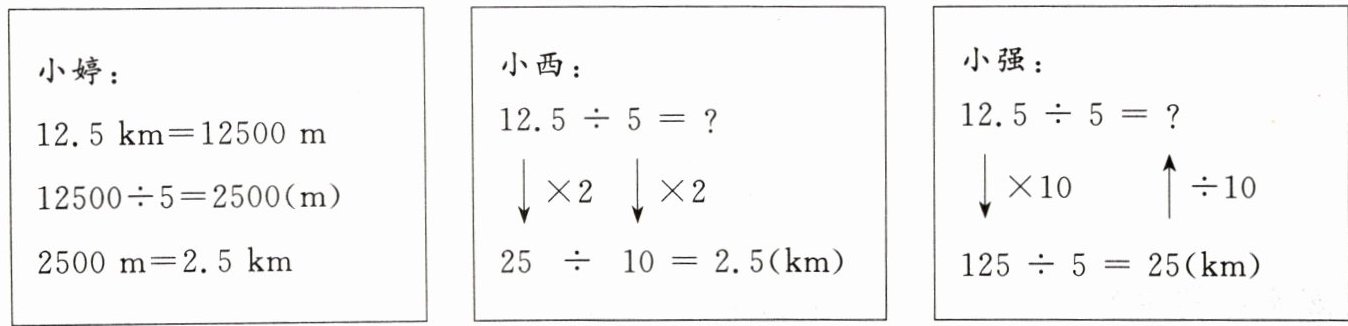 4. 奇奇同学计划周一至周五一共骑行 $12.5km$,他平均每天骑行多少千米?在计算 $12.5÷5$ 时,三名同学有不同的计算方法(见下图),计算正确的有()。