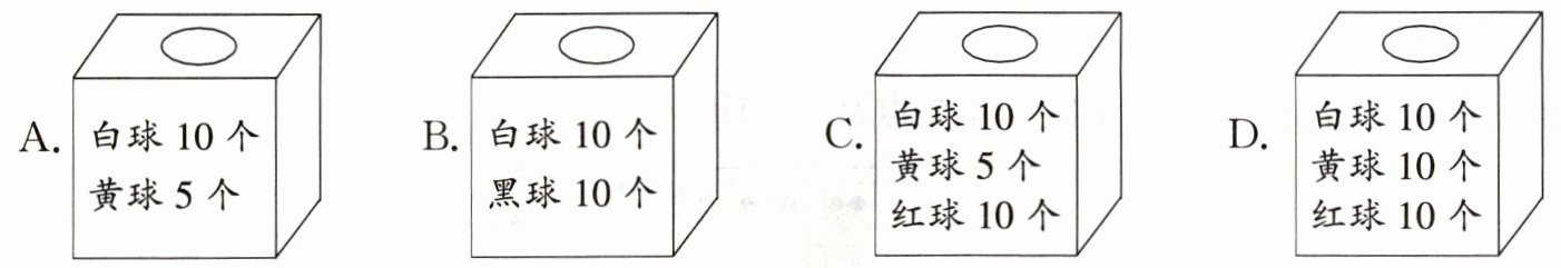 4. 聪聪和乐乐玩摸球游戏,每次任意摸出一个球后记录下颜色,再将其放回并摇匀。摸到白球,聪聪得1分;摸到黄球,乐乐得1分;摸到其他颜色的球,两人都不得分。每人摸10次,在下面()箱中摸球最公平。
