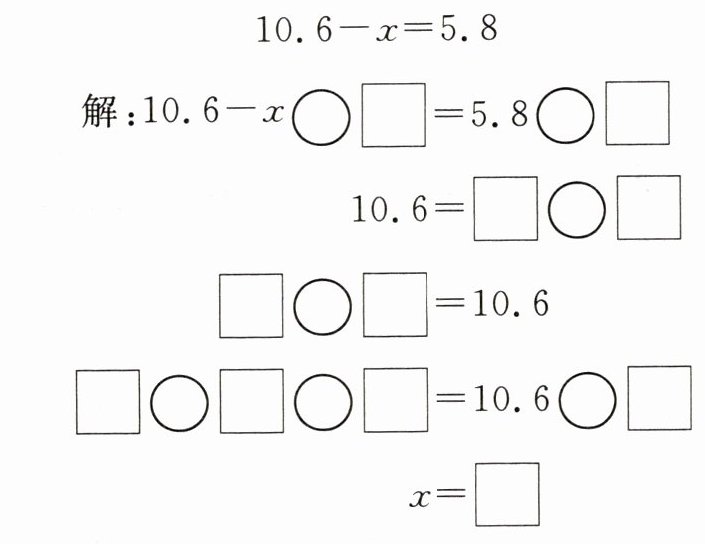 【解析】:10.6 - x + x = 5.8 + x;5.8 + x;5.8 + x - 5.8 = 10.6 - 5.8;4.2