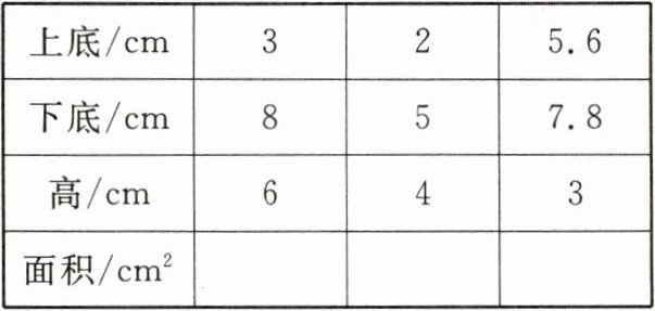 | 上底/cm | 下底/cm | 高/cm | 面积/cm² |