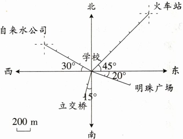 ②百货大楼在广场西偏北25°方向上,距离是400 m。
