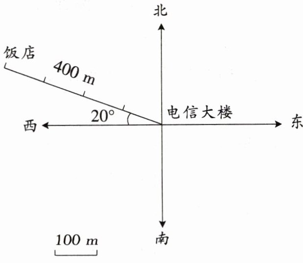(1)公交车站在电信大楼东偏南50°方向上,距离是200 m。请在图中标出公交车站的位置。