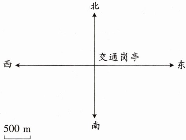 1. 确定交通岗亭为观测点,图中已给出方向标(上北下南左西右东)及线段比例尺(1段代表500m)。