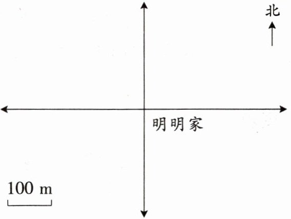 1. 从明明家向西偏北30°方向画2段(每段代表100m),端点处标“银行”。