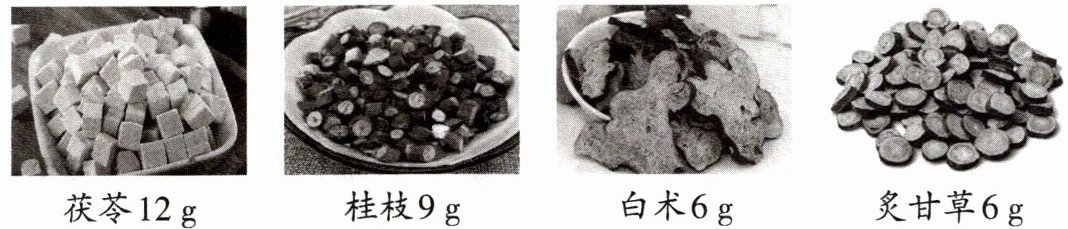 (2)药房准备熬制苓桂术甘汤,按照配比共准备了 231 g 药材(没有剩余),其中茯苓、桂枝、白术和炙甘草分别有多少克?