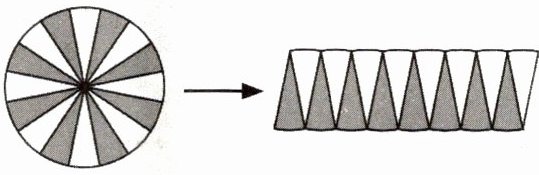 3. 如图所示,把一张圆形纸片沿半径平均分成若干份,拼成一个近似长方形的图形。若长方形面积为$78.5 cm^2,$则圆的周长为( )cm。