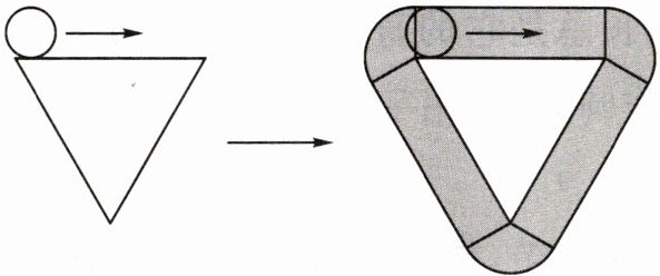 13. 如下图所示,等边三角形的边长是小球周长的两倍,小球的半径为1 cm。若这个小球按箭头方向从某一位置沿着等边三角形的三条边进行不滑动的滚动,直至回到出发位置。请你根据下面的步骤计算小球滚过的面积。