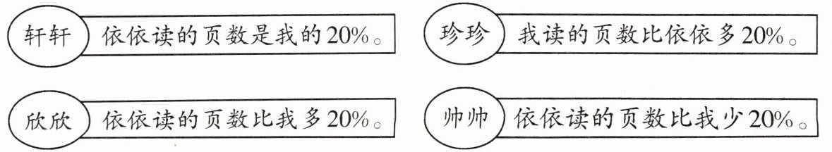 7. 某校开展班级阅读活动,五名同学读同一本书,依依读了60页。结合下图所示信息可知,用方程$x + 20\%x = 60$可计算出( )读的页数。