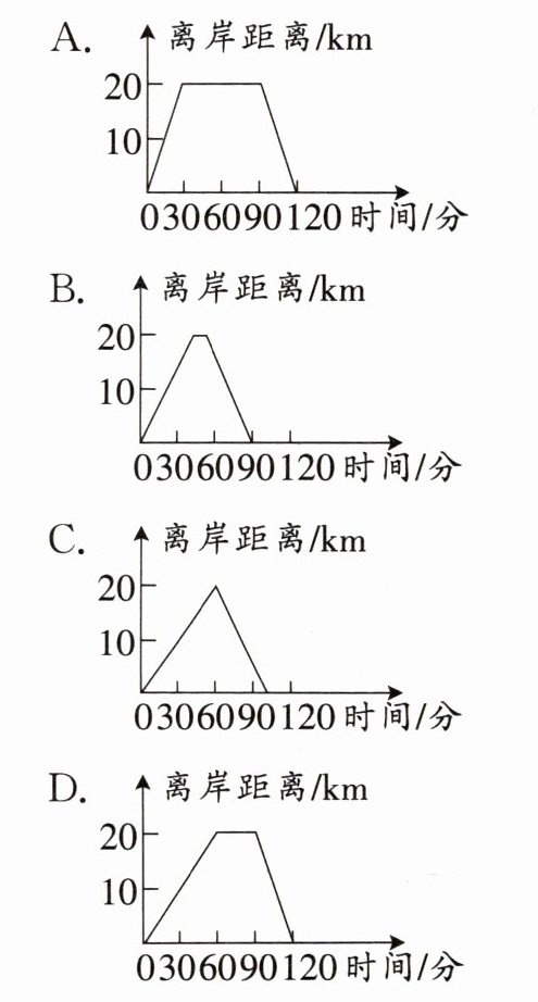 (1)某度假村开发了一个新的观光项目。游客去一个离海边20 km的岛屿观光,乘快艇30分钟可以到达,登岛观光1小时,返回用时还是30分钟;乘大型观光船1小时可以到达,船到达后立刻返航,返回用时40分钟;乘小型观光船40分钟到达,船到达10分钟后返航,返回用时还是40分钟。下面几幅图中描述快艇的是( ),描述大型观光船的是( ),描述小型观光船的是( )。