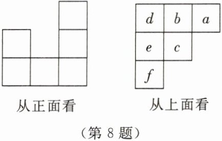 8. 用小立方块搭一个几何体,使其从正面和从上面看到的形状图如图所示。其中,从上面看到的形状图中,每个小正方形中的字母表示该位置小立方块的个数,请解答下列问题。