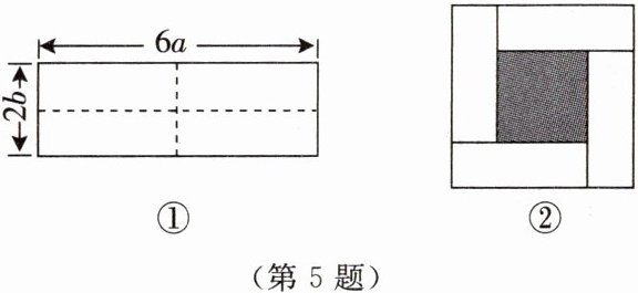 5. 如图①所示,将一个长为$6a$、宽为$2b$的长方形沿图中虚线裁剪成四个相同的小长方形,并按图②的方式拼出一个大正方形,则这个大正方形的周长是