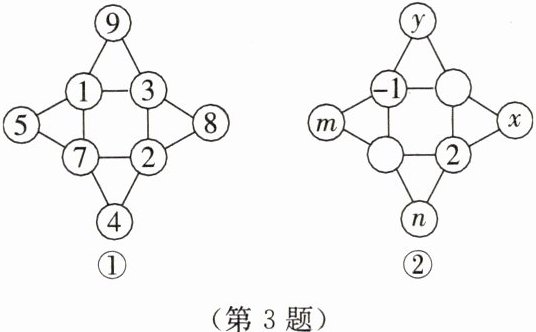 3. “幻方”最早记载于春秋时期的《大戴礼》中,现将 1,2,3,4,5,7,8,9 这八个数字填入如图①所示的“幻方”中,使得每个三角形的三个顶点上的数字之和都与中间正方形四个顶点上的数字之和相等。现有如图②所示的“幻方”,则$(x - y)^{m - n}$的值是
