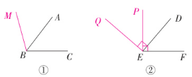 (填“$\gt$”“$\lt$”或“$=$”)$\angle DEF$。(2)在图①中,利用量角器作$\angle ABM$,使得$\angle ABM=\angle ABC$。(点$M$不在射线$BC$上)