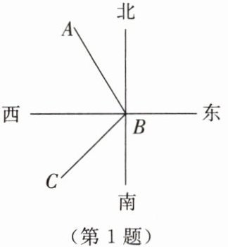 1. 如图所示,某舰艇行驶到 $ B $ 处时,测得海岛 $ A $、轮船 $ C $ 的方向分别为北偏西 $ 30^{\circ} $ 和西南方向,则 $ \angle ABC $ 的大小是