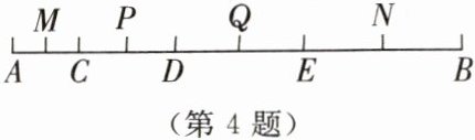 4. 如图所示,点 $ C $,$ D $,$ E $ 将线段 $ AB $ 分成四个部分,且 $ AC : CD : DE : EB = 2 : 3 : 4 : 5 $,$ M $,$ P $,$ Q $,$ N $ 分别是 $ AC $,$ CD $,$ DE $,$ EB $ 的中点,且 $ MN = 21 $,求 $ PQ $ 的长。