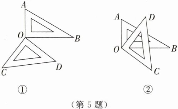 5. (1)如图①所示,将一副三角尺的直角顶点重合在点 $ O $ 处。$ \angle AOD $ 和 $ \angle BOC $ 相等吗?请说明理由。$ \angle AOC $ 和 $ \angle BOD $ 有怎样的数量关系?请说明理由。