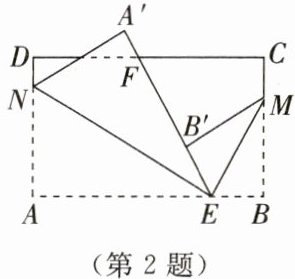 2. 如图所示,在长方形纸片 $ ABCD $ 中,点 $ E $,$ F $ 分别在边 $ AB $,$ CD $ 上,连接 $ EF $。将 $ \angle BEF $ 对折,点 $ B $ 落在直线 $ EF $ 上的点 $ B' $ 处,得折痕 $ EM $;将 $ \angle AEF $ 对折,点 $ A $ 落在直线 $ EF $ 上的点 $ A' $ 处,得折痕 $ EN $。$ \angle NEM $ 的大小为(