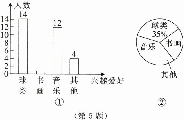 5. 小红对本班同学的业余爱好进行了一次调查。她根据收集到的数据,绘制了下面两幅不完整的统计图。