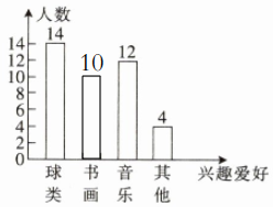 (2)在图②中,求出“球类”部分所对应的圆心角的度数,并分别写出爱好“音乐”“书画”“其他”的人数占本班学生人数的百分比。