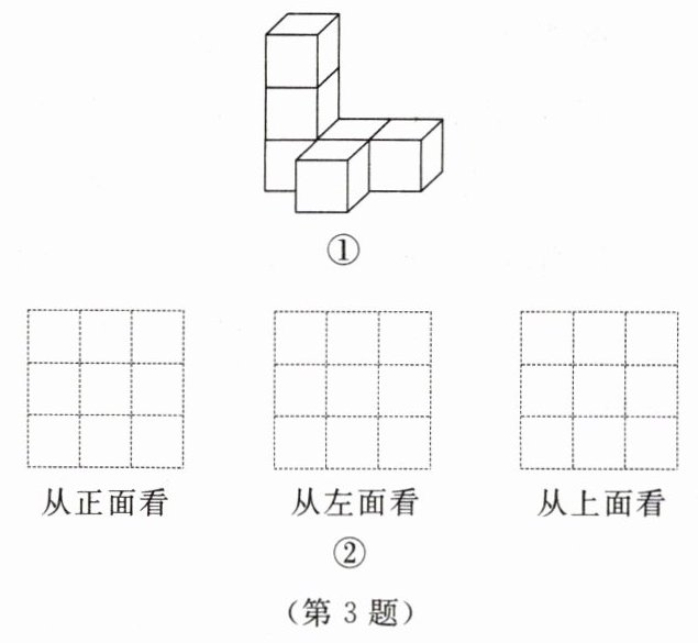 3. 图①是由6个大小相同的小立方块搭成的一个几何体,每个小立方块的棱长均为1 cm。