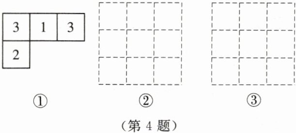 4. 一个几何体由一些大小相同、棱长为1的小立方块搭成,从上面看到的这个几何体的形状图如图①所示,其中小正方形中的数字表示在该位置的小立方块的个数。