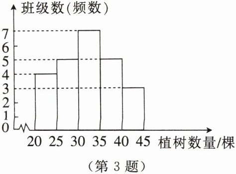 3. 某校在植树节当天组织各班级开展植树活动,事后统计了各班级的植树数量,并绘制成如图所示的频数直方图(每组包含前一个数值,不包含后一个数值)。根据统计结果,下列说法错误的是