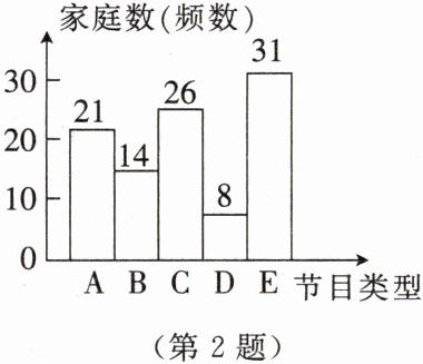 2. 某电视台对A,B,C,D,E五类节目在18~22时的收视情况进行了调查,绘制成如图所示的频数直方图。从统计图中可以看出此次调查的家庭数为