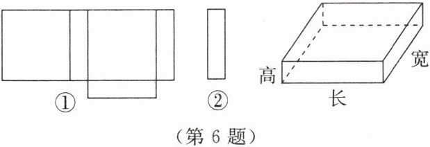 6. 小明在家用剪刀剪开了一个长方体纸盒,可是一不小心多剪了一条棱,把纸盒剪成了两部分,即下图中的①和②。根据你所学的知识,回答下列问题。