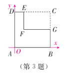 3. 如图,四边形 $ ABCD $ 是边长为 4 的正方形,在正方形的一个角上剪去长方形 $ CEFG $,其中 $ E $, $ G $ 分别是边 $ CD $, $ BC $ 上的点,且 $ CE = 3 $, $ CG = 2 $,剩余部分是六边形 $ ABGFED $。请你建立适当的平面直角坐标系,并写出六边形 $ ABGFED $ 各顶点的坐标。