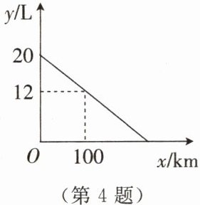 4. 某品牌汽车油箱的容量为 $ 20 \, L $。油箱中剩余油量 $ y $(单位:$ L $)与汽车行驶路程 $ x $(单位:$ km $)之间的关系如图所示。$ 10 \, L $ 汽油可供该汽车行驶