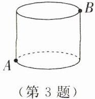 3. 如图,圆柱的底面周长是 $24$,高是 $5$。在圆柱下底面的点 $A$ 处有一只蚂蚁,如果它想吃到点 $B$ 处的食物,那么它沿圆柱侧面爬行的最短路程是(