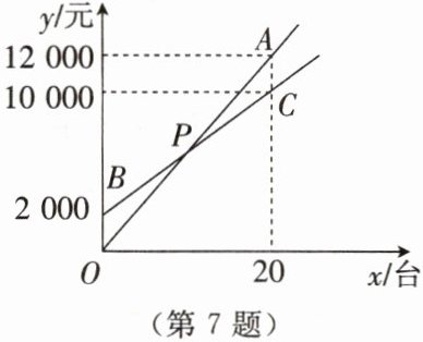 7. 某经销商销售一种燃气加热器。如图,射线 $ OA $ 反映了其销售收入 $ y_1 $(单位:元)与销售量 $ x $(单位:台)之间的关系;射线 $ BC $ 反映了其销售成本 $ y_2 $(单位:元)与销售量 $ x $(单位:台)之间的关系,其中 $ x \geq 0 $。根据图象解答下列问题。