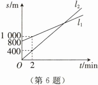 6. 小华和小明相约去公园锻炼,小华家、小明家及公园大门顺次在一条直线上,小华家和小明家之间的距离为 $ 800 \, m $,两人分别同时从家出发,均保持匀速行走。如图,$ l_1 $,$ l_2 $ 分别表示小明、小华两人到小华家的距离 $ s $(单位:$ m $)与两人行走的时间 $ t $(单位:$ min $)之间的关系。