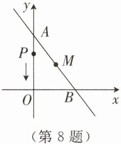 8. 如图,直线$y = kx + b$($k\neq 0$)与坐标轴分别交于$A$,$B$两点,$OA = 8$,$OB = 6$,点$M(3,m)$在直线上。动点$P$从点$A$出发,以每秒$1$个单位长度的速度沿路线$A\to O\to B$运动,到达点$B$时运动停止。设点$P$的运动时间为$t\ s$。