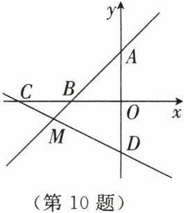 10. 如图,已知直线 $ y_1 = x + 3 $ 与坐标轴交于 $ A $,$ B $ 两点,直线 $ y_2 = -\dfrac{1}{2}x - 3 $ 与坐标轴交于 $ C $,$ D $ 两点,两直线的交点为 $ M $。