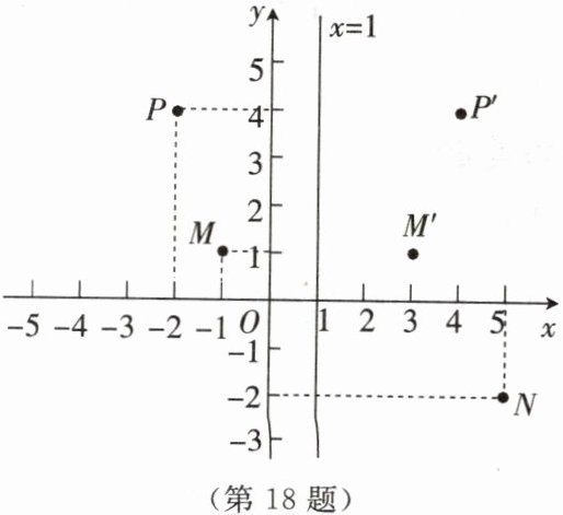 18. 如图,点$P(-2,4)$,$M(-1,1)$关于直线$x = 1$的对称点分别为$P'$,$M'$。