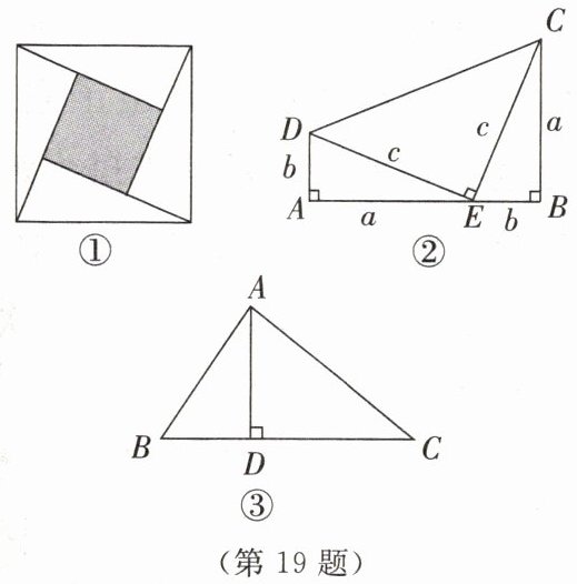 19. 教材在探索平方差公式时利用了面积法,这种方法不仅可以帮助我们记忆公式,还能直观地推导或验证公式,俗称“无字证明”。例如,著名的“赵爽弦图”(如图①所示,其中四个直角三角形较长的直角边的长度都为$a$,较短的直角边的长度都为$b$,斜边的长度都为$c$)中的大正方形的面积可以表示为$c^2$,也可以表示为$4×\frac{1}{2}ab+(a - b)^2$,由此推导出重要的勾股定理:直角三角形两条直角边长度的平方和等于斜边长度的平方,如果用$a$,$b$和$c$分别表示直角三角形的两条直角边和斜边的长度,那么$a^2 + b^2 = c^2$。