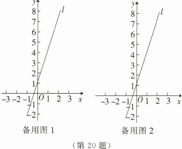 20. 下面表格中的两组对应值满足一次函数$y = kx + b$,现画出了它的图象为直线$l$,如图所示。琪琪为观察$k$,$b$对图象的影响,将上面函数中的$k$与$b$交换位置后得到另一个一次函数,设其图象为直线$l'$。
