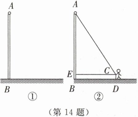 14. 某校数学兴趣小组来到操场上测量旗杆 AB 的高度。小华测得从旗杆顶端垂下的升旗用的绳子比旗杆长 2 m,如图①所示。小明拉着绳子的下端往后退,当绳子拉直时,小华测得此时小明拉绳子的手到地面的距离 CD 为 1 m,到旗杆的距离 CE 为 9 m,如图②所示。求旗杆的高度 AB。