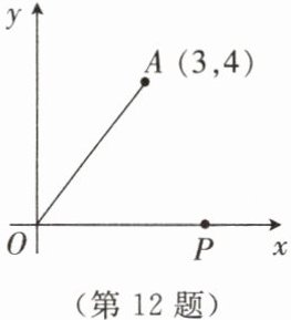 12. 如图,在平面直角坐标系中,点 A 的坐标为 $ (3,4) $,点 P 在 x 轴正半轴上。若以点 P,O,A 为顶点的三角形是等腰三角形,则满足条件的点 P 的坐标为