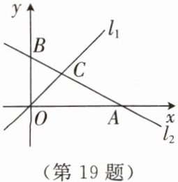 19. 如图,在平面直角坐标系中,直线 $ l_{1} $ 的函数表达式为 $ y = x $,直线 $ l_{2} $ 的函数表达式为 $ y = kx - 5k(k \lt 0) $,直线 $ l_{2} $ 与两坐标轴的交点分别是点 A 和点 B,点 C 是直线 $ l_{2} $ 与直线 $ l_{1} $ 的交点。