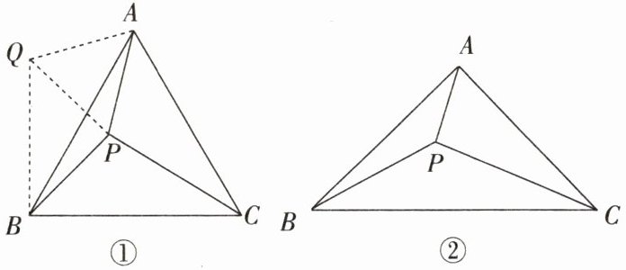 (1)如图①,在等边三角形 ABC 中,P 为三角形内一点,连接 AP,BP,CP。当 $ \angle APB - \angle ABC = 90^{\circ} $ 时,AP,BP,CP 满足 $ AP^{2} + BP^{2} = CP^{2} $。数学兴趣小组的同学们通过讨论,得到了以下思路:以 AP 为边,在 AP 的左侧作等边三角形 APQ,连接 BQ,通过验证 $ \triangle APC \cong \triangle AQB $,从而得到 $ PC = BQ $;再通过验证 $ \triangle PBQ $ 是直角三角形,得到 $ QP^{2} + BP^{2} = QB^{2} $,经等量代换即可得到 AP,BP,CP 的关系。请你根据以上思路,完成推导过程。