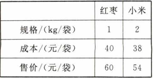 本题考查二元一次方程组的应用,我们可以通过设未知数,根据销售的总重量和总利润列出方程组,进而求解出红枣和小米的销售袋数。