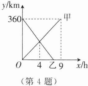 4. $A$,$B$两地相距$360km$,甲、乙两人分别从$A$,$B$两地同时出发,相向而行。甲、乙两人离$A$地的距离$y$(单位:$km$)与行驶时间$x$(单位:$h$)之间的函数图象如图所示。