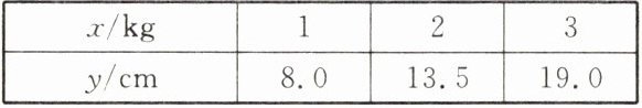1. 杆秤是一种利用杠杆原理来称量物品质量的简易装置,其秤砣到秤毫的水平距离$y$(单位:$cm$)与所挂物体的质量$x$(单位:$kg$)之间满足一次函数关系,如下表所示。$y$与$x$之间的关系式为