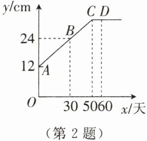 2. 某数学兴趣小组观察记录了莴笋的成长过程,绘制了莴笋的高度$y$(单位:$cm$)与观察时间$x$(单位:天)之间的函数图象,如图所示($CD$平行于$x$轴)。由图象可知,莴笋在第$60$天时的高度是