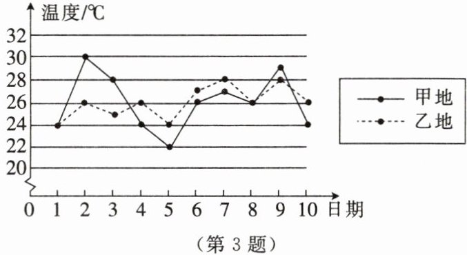 3. 甲、乙两地7月上旬的日平均气温如图所示。甲、乙两地这10天中日平均气温的方差$s_{甲}^{2}$与$s_{乙}^{2}$的大小关系是$s_{甲}^{2}$