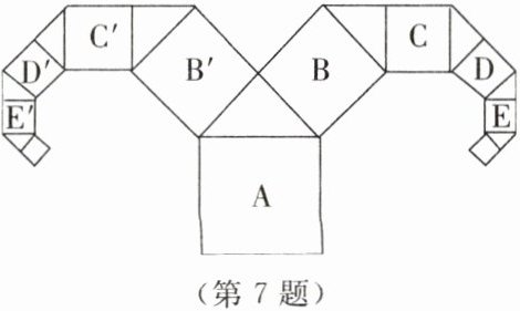 7. 下图是一种“羊头”形图案,其作法:从正方形 $ A $ 开始,以其一边为斜边向外作等腰直角三角形,再以该三角形的直角边为边长分别向外作正方形 $ B $ 和 $ B' $,以此类推。若正方形 $ A $ 的面积为 $ 64 cm^2 $,则正方形 $ E $ 的面积为